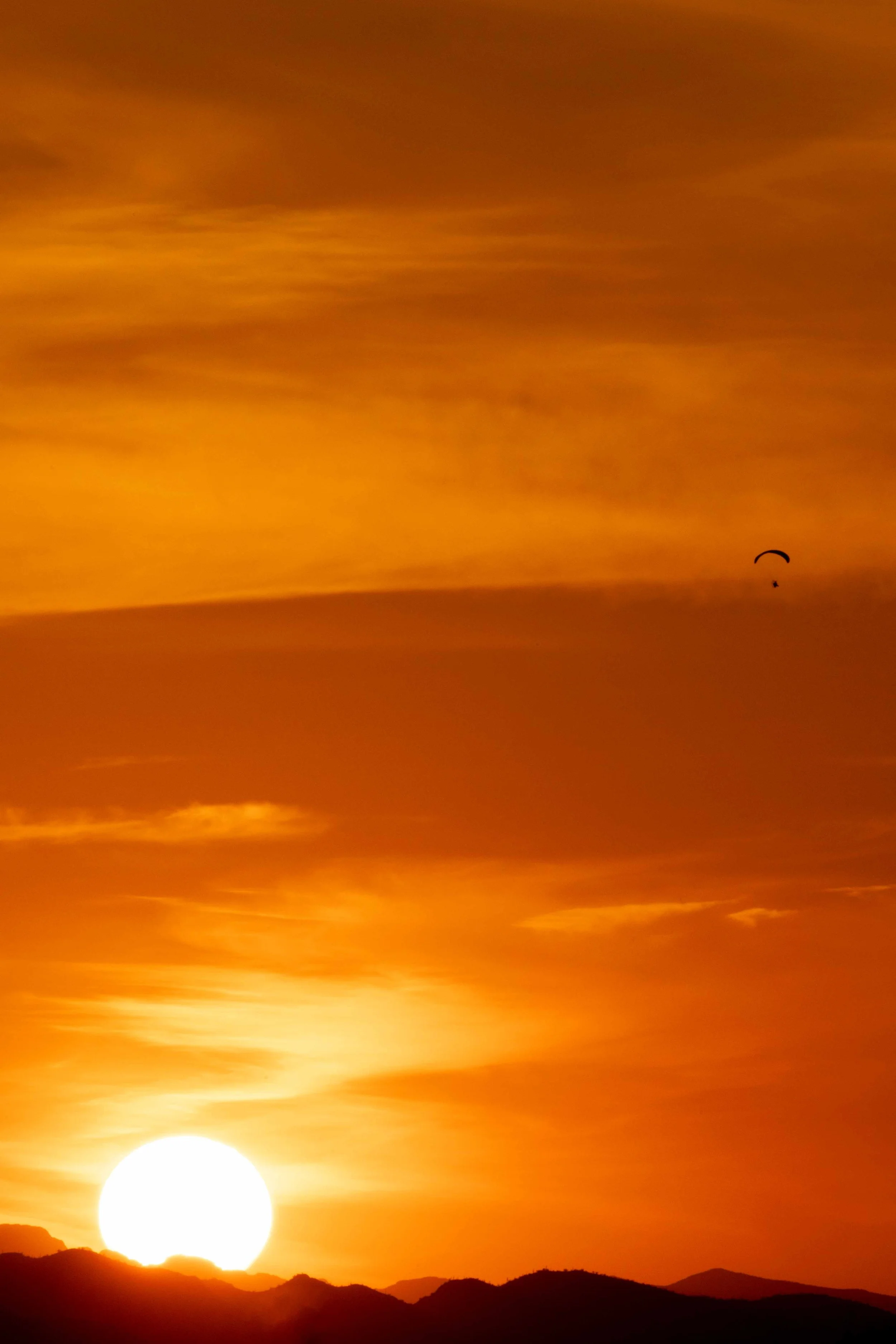 A paraglider soars over the distant skyline as the sun touches the peaks of the Harqualhala Mountains.
